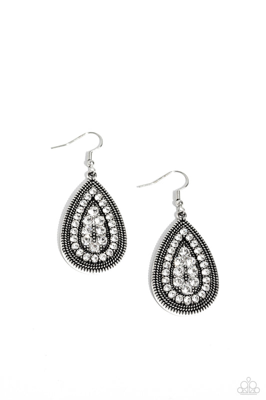 Textured in rows of metallic rope-like patterns, the front of a studded silver teardrop is...