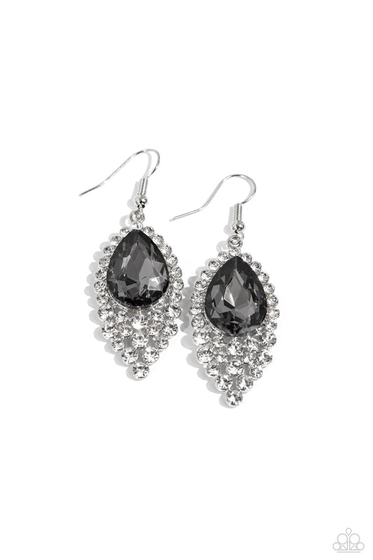 An oversized smoky teardrop gem is pressed into a glittering backdrop of glassy white rhinestones,...