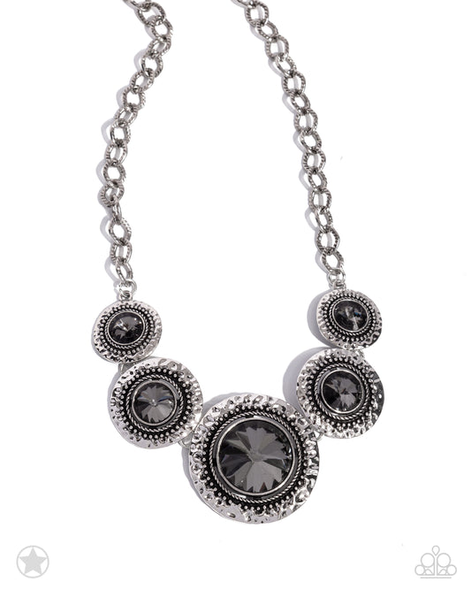 Gradually increasing in size, dramatically oversized smoky gems are pressed into the centers of hammered...