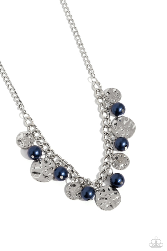 A collection of hammered silver discs and pearly blue beads swing from a thick silver...