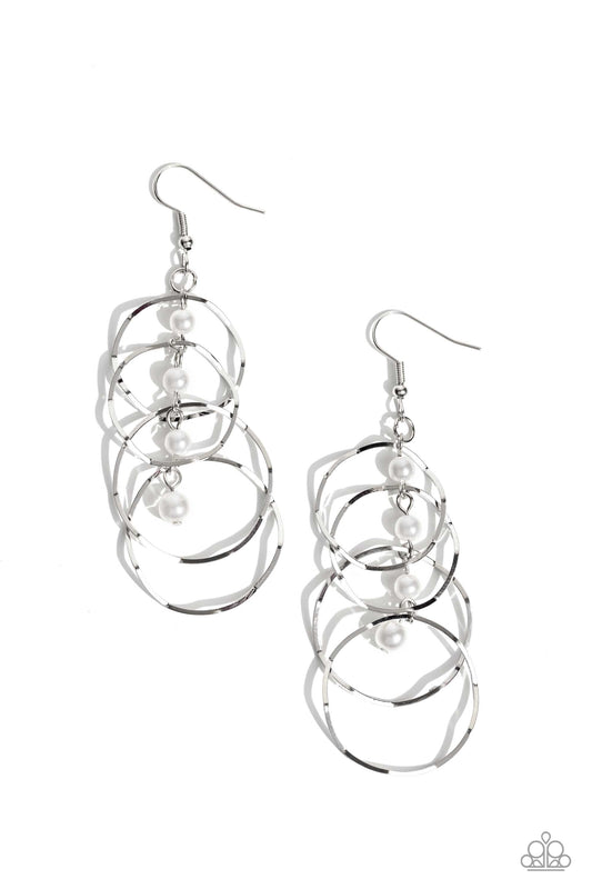 Zigzagging silver hoops trickle from a dainty strand of white pearls, overlapping into a bubbly...