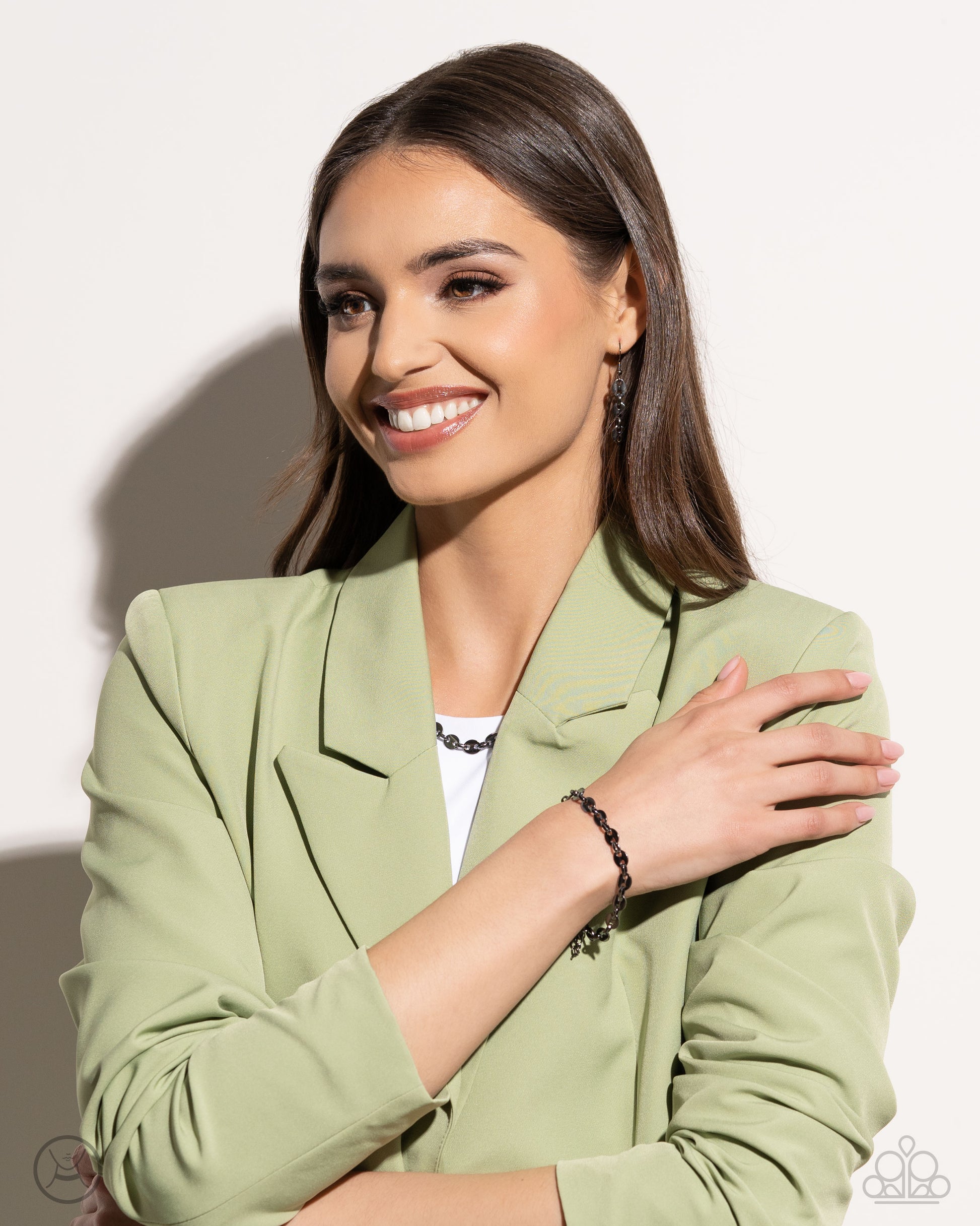 Resembling soda can tabs, an abstract gunmetal chain interlocks around the wrist for an industrial look. Features an adjustable clasp closure.