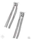 Flat silver snake chains stream from a knotted wreath made from the same material, creating a dramatic shoulder-dusting fringe. Earring attaches to a standard post fitting.