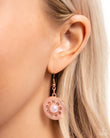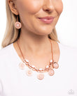 A shiny copper chain connects to large shiny copper rings that interconnect below the collar. Featuring a light pink pearly paint, shiny copper ovals glisten at the top of the rings for a hint of softness. Shiny copper discs with iridescent pearl centers and Desert Flower-painted detailing swing below the oversized jump rings for additional refinement. Features an adjustable clasp closure. Due to its prismatic palette, color may vary.