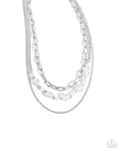 Featuring flecks of iridescent shell-like pieces, opalescent and clear white beads alternate around the neckline for a pop of effervescent color. A dainty classic silver chain and silver paperclip chain layer above and below the beaded strand for additional eye-catching interest and charm. Features an adjustable clasp closure.