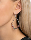 A shiny silver bar asymmetrically bends into an abstract geometric shape. Separated by silver studs, a smoldering border of fiery red rhinestones gradually increases in size along the bottom of the frame for an edgy finish. Earring attaches to a standard fishhook fitting.