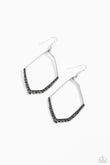 A shiny silver bar asymmetrically bends into an abstract geometric shape. Separated by silver studs, a smoldering border of smoky hematite rhinestones gradually increases in size along the bottom of the frame for an edgy finish. Earring attaches to a standard fishhook fitting.
