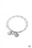 Featuring a subtle iridescent shimmer, a collection of glassy clear white beads are infused along the wrist beside dainty silver studs for a bodacious pop of color. Two silver discs and an iridescent gem slide along a sleek bar fitting on the dainty silver bangle, creating a sentimental statement. Due to its prismatic palette, color may vary.