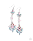 Embellished with iridescent, blue, and pink rhinestones, marquise-cut gems, teardrop gems, and an emerald-cut gem, two silver frames connected by a trio of white and baby pink pearls in varying sizes flair out along the ear for a classy, chic look. Earring attaches to a standard fishhook fitting. Due to its prismatic palette, color may vary.