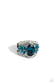 Bordered in dainty rows of glassy white rhinestones, leafy blue rhinestones bloom from a dramatically oversized blue oval rhinestone that coalesces into a glamorous centerpiece atop the finger. Features a stretchy band for a flexible fit.