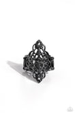 Shiny gunmetal filigree curls into a marquise-shaped display atop the finger. The stenciled design allows the skin to peek beneath the airy pattern for a regal finish. Features a stretchy band for a flexible fit.