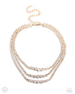 Set in pronged square gold fittings, white rhinestones gradually increase to larger white gems in pronged fittings as they cascade down the chest in a trio of layers for a dynamite display. Features an adjustable clasp closure.