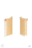 A tapered fringe of mismatched dainty gold chains cascades from the edge of a curving white emerald-cut gem-encrusted frame, creating an edgy centerpiece atop the ear. Features an extended post fitting that climbs the back of the ear and can be pressed together for a more secure fit.