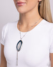Pressed in an abstract, hammered oval frame, a transparent blue geode-like stone glistens below the collar from an abstract silver satellite chain for a blissfully balanced look. Strands of dainty silver classic and satellite chains cascade from the geode pendant for additional detail and eye-catching movement. Features an adjustable clasp closure.