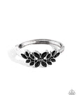 An explosion of marquise cut black rhinestones blooms into a leafy centerpiece atop the front of a silver bangle-like bracelet, resulting in a stunning and stackable statement piece. Features a hinged closure.