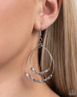 Dainty rectangular beads glide along the bottoms of two silver wires that delicately bend into a layered teardrop. Earring attaches to a standard fishhook fitting.