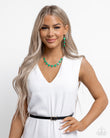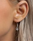 Faceted Mint teardrop beads, pronged in silver fittings alternate in size and gradually decrease in size as they cascade from the ear for a creatively colorful display. Set in round fittings, glistening white gems alternate between each colorful bead for additional interest and sparkle. Earring attaches to a standard fishhook fitting.