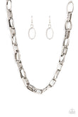 Wide hammered silver links alternate with double sets of shiny silver links as they connect across the collar for an edgy industrial effect. Features an adjustable clasp closure.