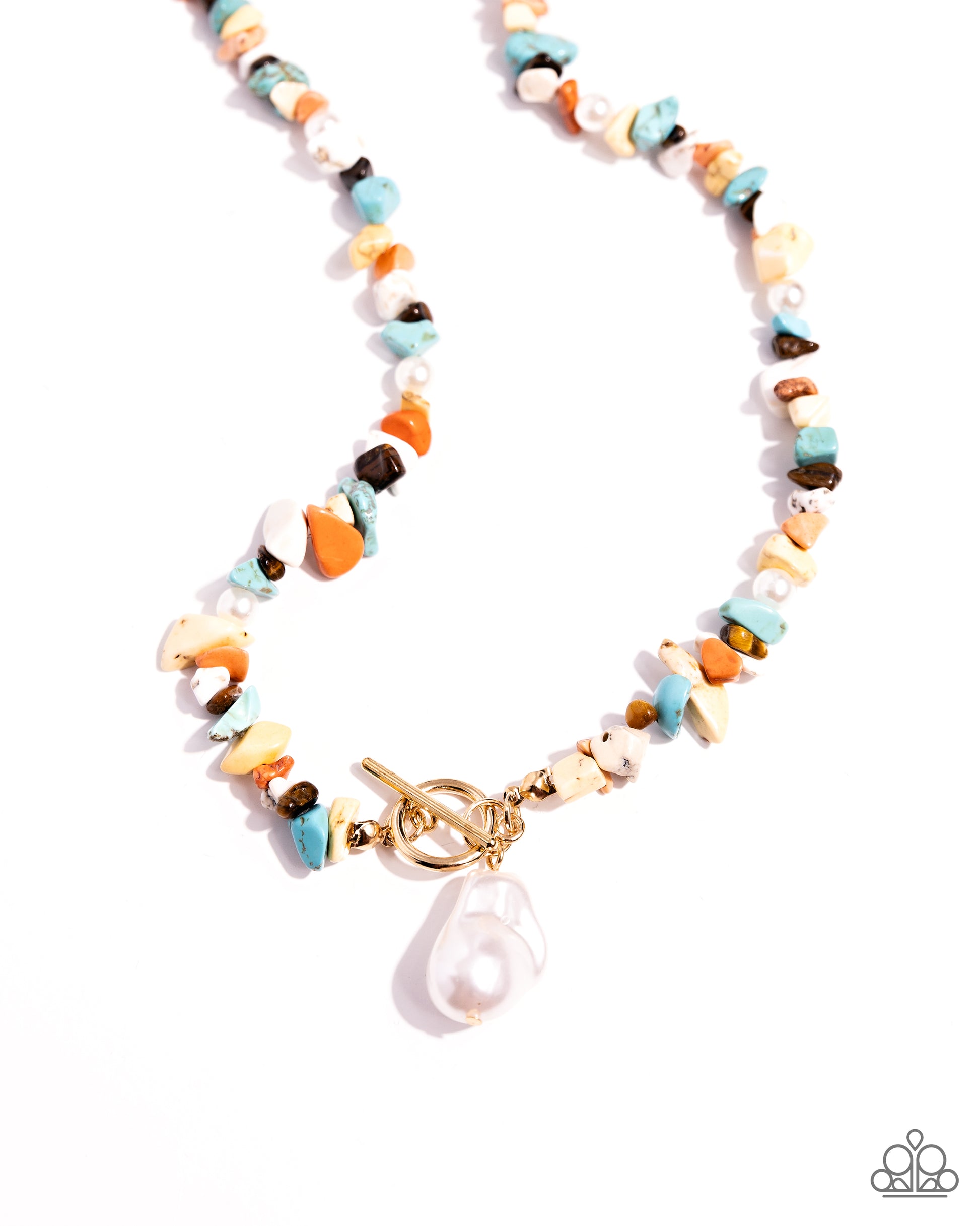 Infused along an invisible string, a collection of various chiseled stones and white pearls loop through a gold toggle clasp closure around the neckline for an elegantly, earthy statement. An oversized baroque white pearl is looped through the other side of the toggle clasp closure for an additional touch of sheen. Features an adjustable clasp closure. As the stone elements in this piece are natural, some color variation is normal.
