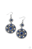 A bubbly collection of Mykonos Blue cat's eye stones and glassy white rhinestones embellish the front of a studded silver frame. The circular frame swings from the bottom of a matching floral fitting, creating an effervescent fashion. Earring attaches to a standard fishhook fitting.