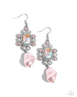Featuring a UV shimmer, a faceted emerald-cut pink gem is bordered by a collection of glossy white and baby pink pearls in textured frames. An oversized baroque baby pink pearl gives way from the glittery frame for additional whimsical sway and coastal detail. Earring attaches to a standard fishhook fitting.