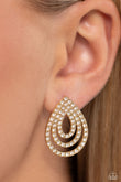 Golden ribbons of dainty white rhinestones layer into a dazzling teardrop frame, resulting in a rippling resplendence. Earring attaches to a standard post fitting.