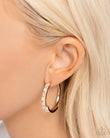 Infused with glistening white rhinestones a thin gold hoop encircles the ear. Pressed in gold-pronged fittings emerald-cut white gems delicately swoop asymmetrically along the gold hoop for additional glitz, completing the demurely layered look. Earring attaches to a standard post fitting. Hoop measures approximately 1 1/2" in diameter.