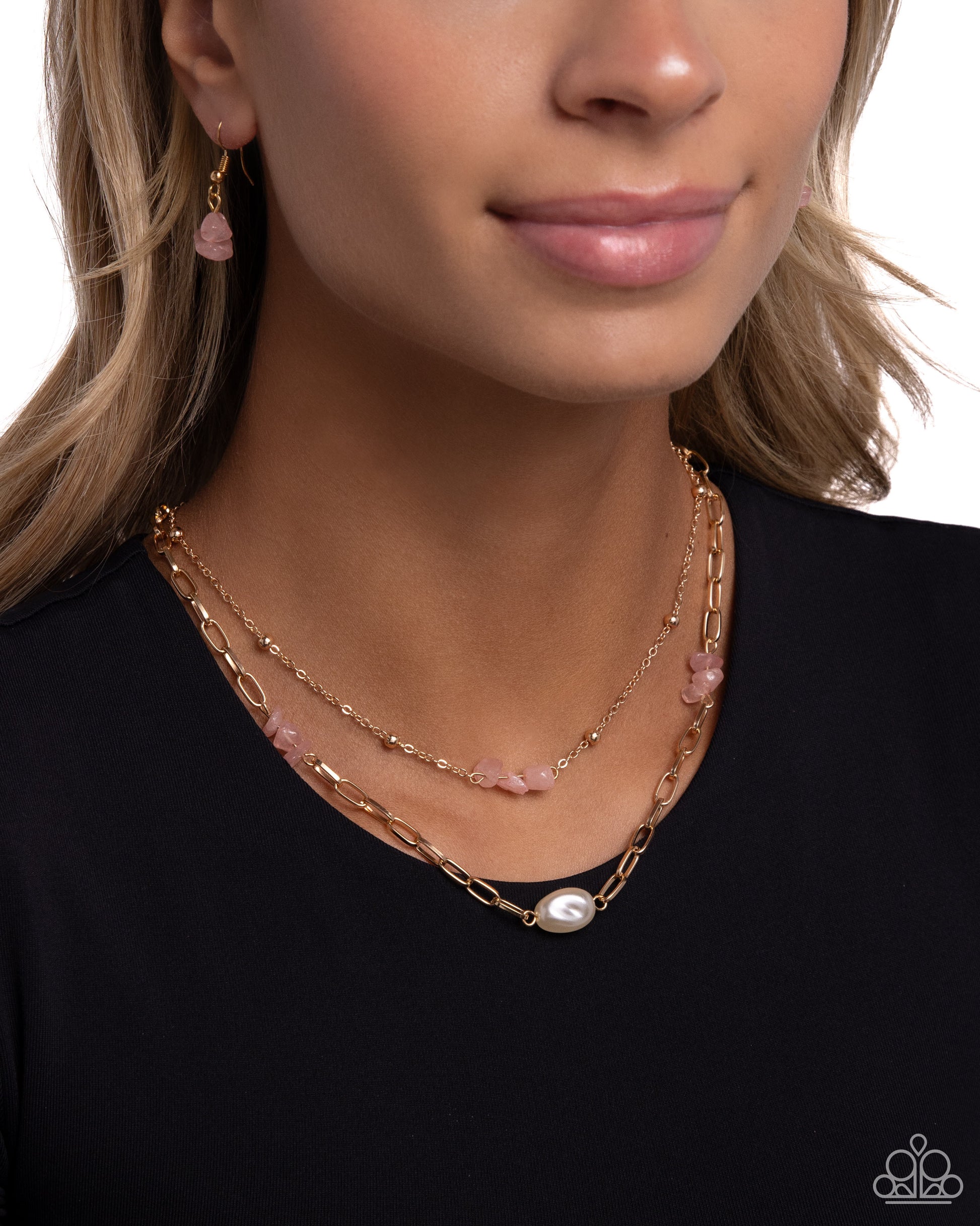 Infused along a gold paperclip and satellite chain, a collection of chiseled pink stones and a baroque white pearl layer below the collar for a Santa Fe-inspired statement. Features an adjustable clasp closure. As the stone elements in this piece are natural, some color variation is normal.