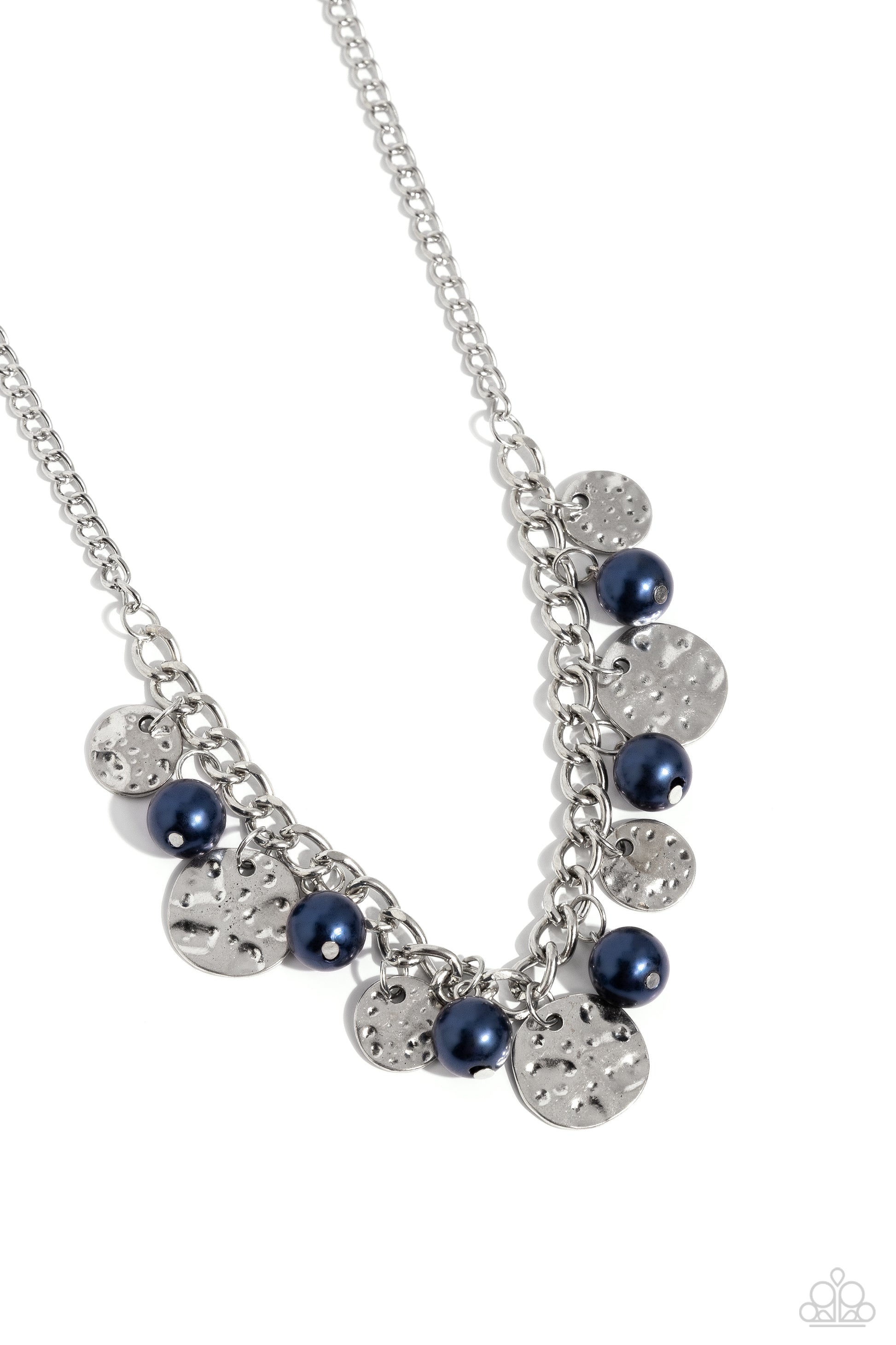 A collection of hammered silver discs and pearly blue beads swing from a thick silver chain, creating an elegant fringe below the collar. Features an adjustable clasp closure.
