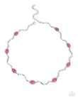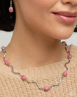 Striped pink oval beads pronged in silver alternate with wavy silver bars below the collar for an asymmetrical, artistic statement. Features an adjustable clasp closure.