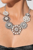 Polished white pearls and brilliant white rhinestones bloom atop a framework of silver, forming seven unique flowers adorned in dizzying detail. Each flower features a unique centerpiece encircled by silver petals lined with luminescence and intricate detail. The flourish of florals links whimsically along the neckline, resulting in an unforgettable statement piece that sparkles with sentiment. Features an adjustable clasp closure.
