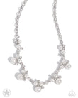 Clusters of pearls and dazzling white rhinestones join below the collar, creating refined frames. Infused with a glistening silver chain, the sections of luminescent frames trickle along the neck in a timeless fashion. Features an adjustable clasp closure.