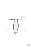 An oversized iridescent white bead is nestled inside a textured silver frame atop an airy silver cuff, creating a mystical centerpiece.